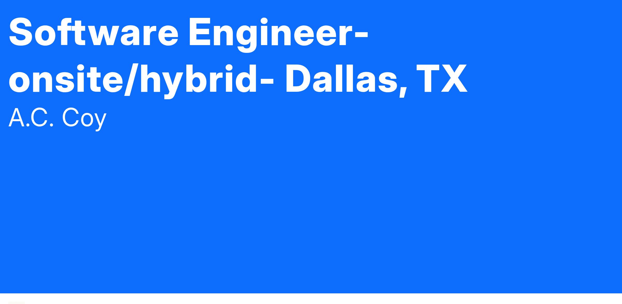 The A.C.Coy Company has an immediate opening for a Software Engineer for an onsite/hybrid role in Dallas, TX. You will be part of a team developing custom software applications from the ground up and integrate those applications with 3rd pary applications.